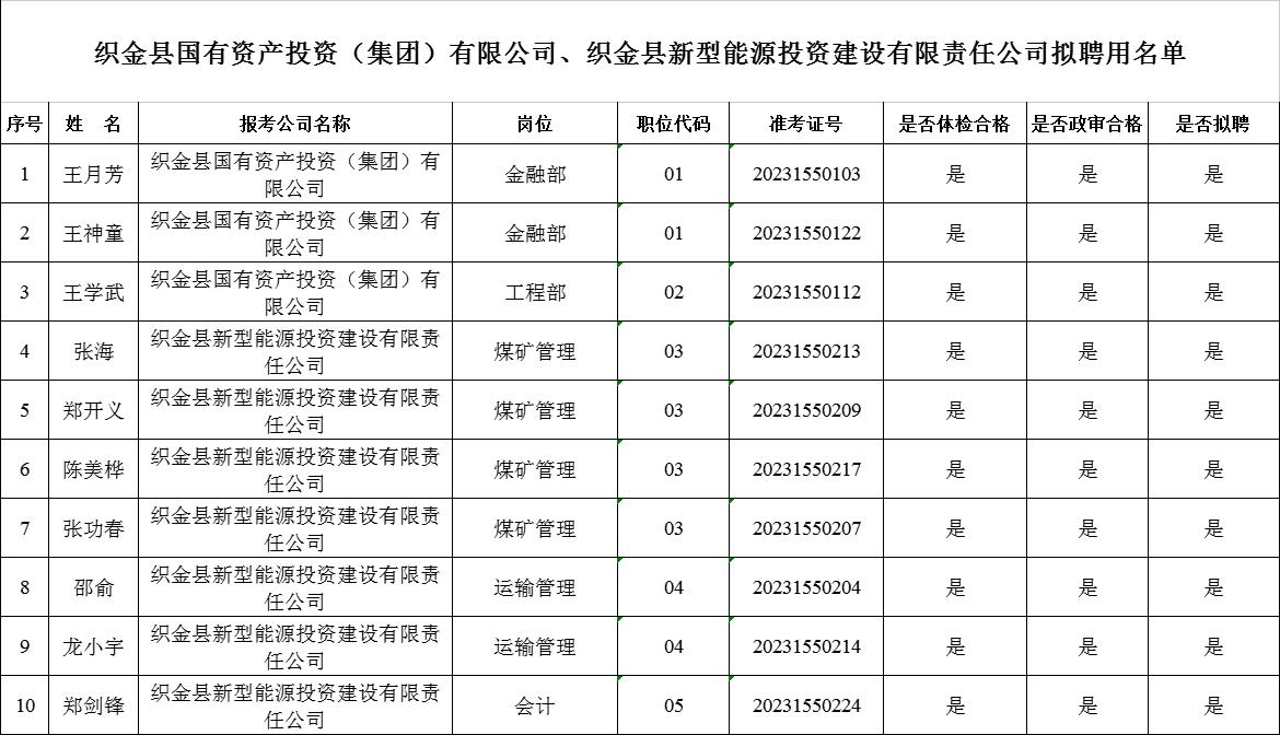 根據(jù)《織金縣國有資產(chǎn)投資(集團(tuán))有限公司、織金縣新型能源投資建設(shè)有限責(zé)任公司2023年面向社會(huì)公開招聘工作人員公告》,經(jīng)過報(bào)名、筆試、面試、資格審查、體檢、政審等程序,現(xiàn)對擬聘用人(名單見附件1)予以公示。